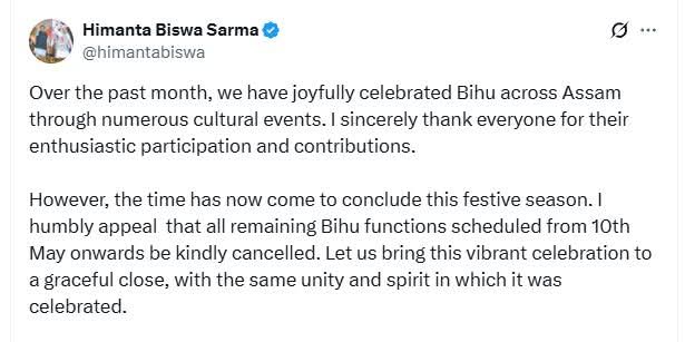 তাৰ মাজতে অসমৰ মুখ্যমন্ত্ৰী ডঃ হিমন্ত বিশ্ব শৰ্মাই এক গুৰুত্বপূৰ্ণ আহ্বান জনাইছে। বৰ্তমান অসমত চলি আছে ব’হাগ বিহুৰ বতৰ। ৰাজ্যৰ বিভিন্ন প্ৰান্তত অনুষ্ঠিত হৈ আছে বিহু অনুষ্ঠান। কিন্তু ভাৰত-পাক সীমান্তত সংঘটিত পাক আক্ৰমণত বহু নিৰীহ লোকে প্ৰাণ হেৰুৱাবলগা হোৱা ঘটনাৰ বাবে মুখ্যমন্ত্ৰীয়ে বিহু সমিতিসমূহলৈ বিশেষ বাৰ্তা প্ৰদান কৰিছে।